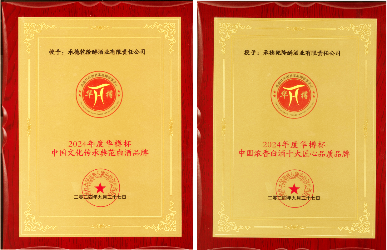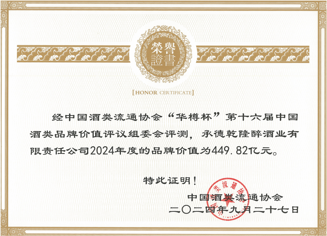 板城酒業(yè)憑借過硬的綜合實(shí)力得到行業(yè)肯定及評(píng)審專家的認(rèn)可,經(jīng)中國酒類流通協(xié)會(huì)“華樽杯”第十六屆中國酒類品牌價(jià)值評(píng)議組委會(huì)評(píng)測(cè),承德乾隆醉酒業(yè)有限責(zé)任公司(板城酒業(yè))2024年度的品牌價(jià)值為449.82億元,中國白酒行業(yè)排名三十位,同時(shí),榮獲“2024年度華樽杯中國濃香白酒十大匠心品質(zhì)品牌”、“2024年度華樽杯中國文化傳承典范白酒品牌”獎(jiǎng)項(xiàng),充分彰顯了冀酒的品質(zhì)自信,也傳遞出行業(yè)、社會(huì)對(duì)板城酒業(yè)品牌文化的高度認(rèn)可。