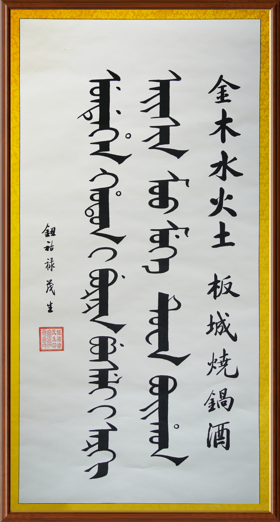 近日,板城酒業(yè)榮幸地收到了一幅珍貴的書(shū)法作品。這幅作品不僅體現(xiàn)了板城酒業(yè)深厚的文化淵源,更用滿漢兩種語(yǔ)言書(shū)寫(xiě)了“金木水火土,板城燒鍋酒”的千古妙對(duì),成為了板城燒鍋酒博物館館藏的一件獨(dú)特藝術(shù)瑰寶。