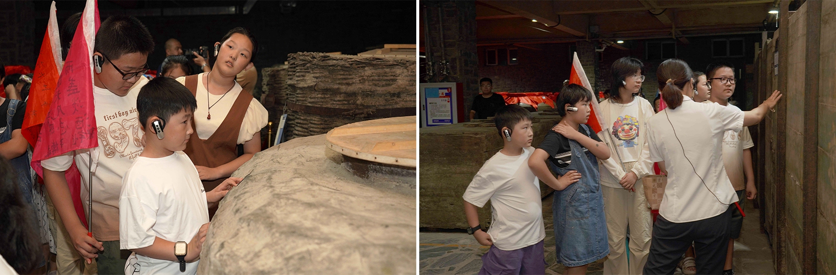 研學(xué)首站來(lái)到彌漫著酒曲氣息的慶元亨酒坊,孩子們近距離觀察窖池群落,聆聽(tīng)“國(guó)家級(jí)非物質(zhì)文化遺產(chǎn)老五甑釀酒技藝”的釀酒原理。在恒溫恒濕的乾元酒窖,近距離觀察探索酒海、酒簍、陶壇交替儲(chǔ)存的奧秘,他們化身小小觀察員,分組協(xié)作,細(xì)致追蹤,在實(shí)踐記錄中深刻領(lǐng)悟糧食的珍貴與匠心。